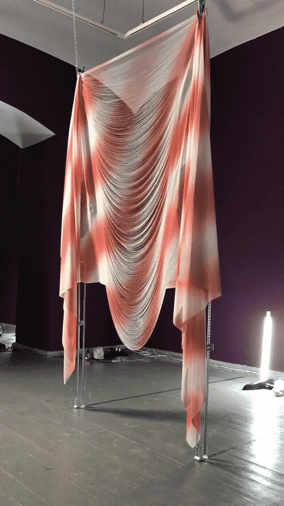 Printed organza, silk, technical textile, CuNi textile, Neodymiun magnets, LED lights, limestone, aluminum extrutions, relays, custom hardware, Organelle, MacBook Pro, MaxMSP, variable dimensions